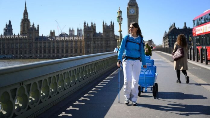 Comedian and television personality Ellie Taylor embarked on a journey through London while fully equipped with hiking gear today to demonstrate against the escalating costs of mobile phone bills. Donning a heavy backpack, hiking poles, and a buggy, Ellie, in collaboration with Lebara, was observed traversing Westminster Bridge towards Parliament and various landmarks.