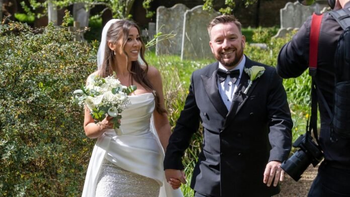 Emerging from the church in a stylish black suit, former Spurs soccer player Jamie O’Hara was seen holding hands with his new spouse, Keziah Grubb. This marriage marks Jamie’s second, following his previous union with reality TV personality and model Danielle Lloyd, which ended in divorce in 2014.