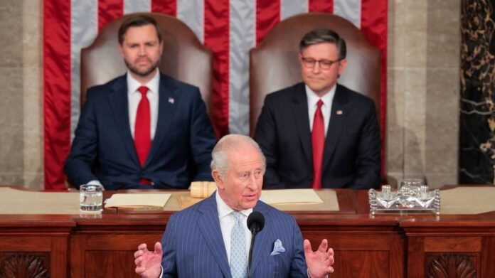 King Charles delivered a speech to the members of the US Congress, emphasizing the strong relationship between the US and UK amidst global tensions, which garnered a positive response with a widespread standing ovation.