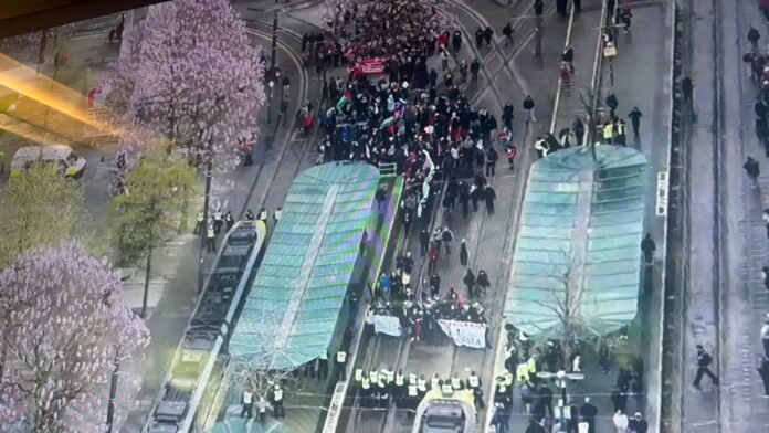 Tram services in Manchester city center came to a standstill this afternoon due to a Britain First march taking place. Supporters of the far-right group gathered at Store Street near Manchester’s Piccadilly station around noon, starting their march towards St Peter’s Square just before 1.10pm.