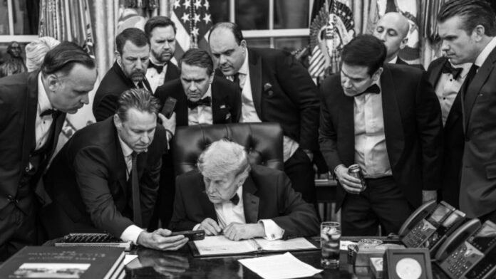 A striking new image depicts President Donald Trump observing the aftermath of the White House shooting incident that occurred on Saturday, accompanied by his Cabinet members.