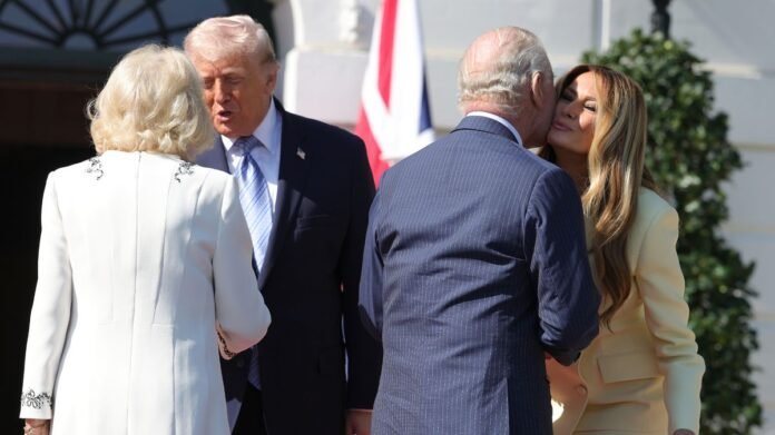 President Donald Trump and First Lady Melania warmly welcomed King Charles III and Queen Camilla of an unidentified country upon their arrival in the United States today. The cordial greetings included kisses and handshakes, sparking discussions about the proper protocol for this significant royal visit.