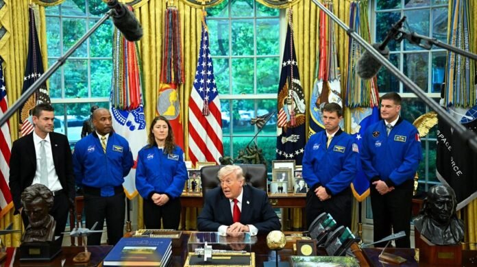 The Artemis II mission’s four astronauts, who recently ventured farther from Earth than any other humans in history, were greeted at the White House. President Trump’s remarks during the event have sparked ridicule.