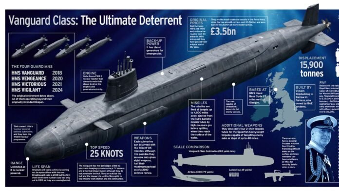 In the depths of the world’s oceans, a formidable Vanguard-Class ballistic submarine silently maneuvers, carrying the UK’s nuclear deterrent capability. Valued at £6 billion, this sleek vessel, capable of reaching speeds up to 25mph, stands as the most potent maritime weapon in the Royal Navy’s arsenal, poised to defend Britain against potential threats.