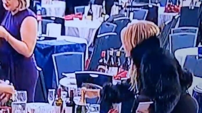 While attendees scrambled to evacuate, an unidentified woman in a black fur coat was captured on camera heading straight to a table to collect untouched alcohol bottles from the disrupted event.